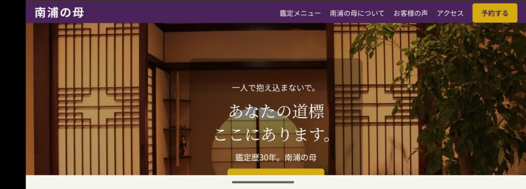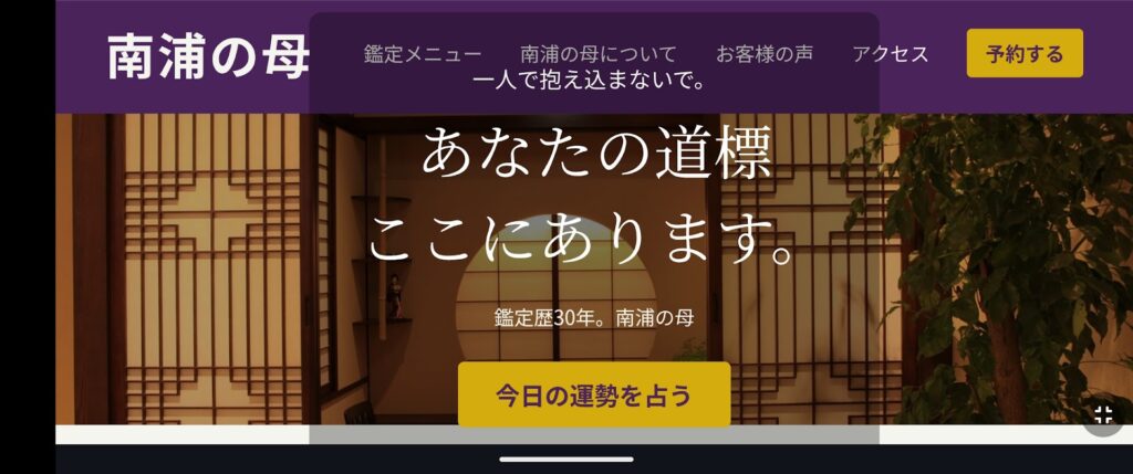 現在、制作している「南浦の母」のWebサイト。 スマホの縦画面は完璧にできていたのですが、ふと「横向き(ランドスケープ)」にしてみたら……ロゴとメニューが重なって、見るも無惨な状態に。